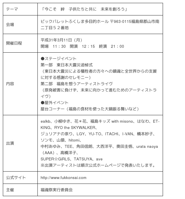 東日本大震災復興イベント「第8回福魂(ふっこん)祭 〜今こそ 絆 子供たちと共に 未来を創ろう〜」への協賛のお知らせ