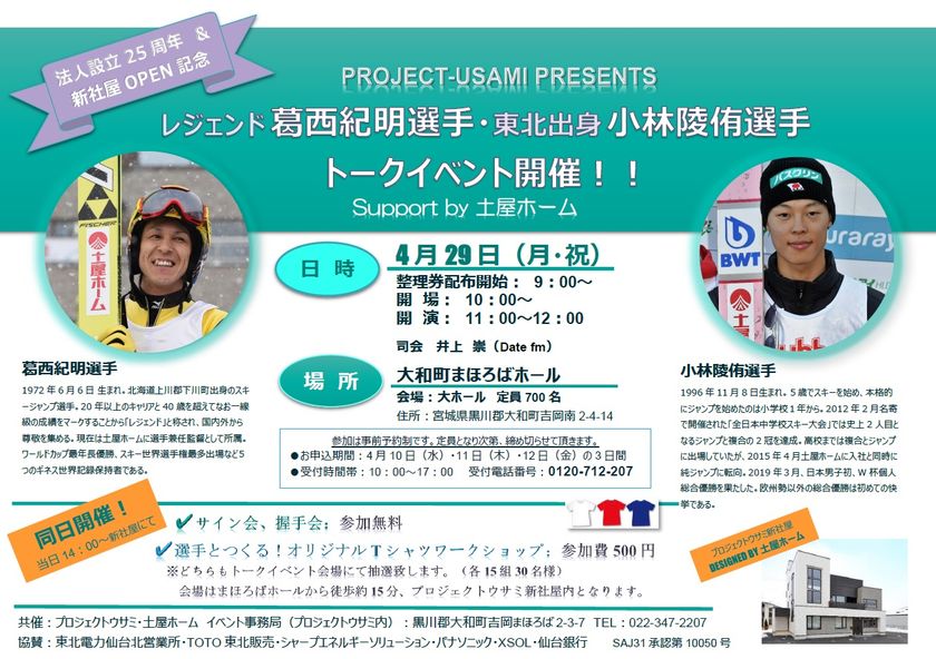 法人設立25周年及び太陽光発電事業18周年を迎える、株式会社プロジェクトウサミ(本社:宮城県黒川郡大和町吉岡まほろば2-3-7、代表取締役:宇佐美 美由紀、以下 プロジェクトウサミ)が、法人設立25周年と昨年完成した新社屋の落成を記念して、来る4月29日、スキージャンプ界のレジェンド葛西 紀明選手と、今季日本男子初の快挙となるW杯総合優勝を果たした小林 陵侑選手の貴重なトークイベントを大和町まほろばホールにて開催します。