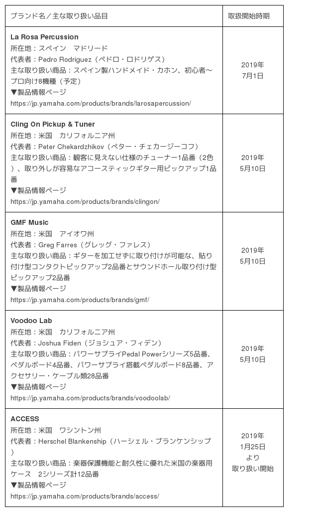 株式会社ヤマハミュージックジャパン(本社:東京都港区、代表取締役社長:押木正人)は、カホンのブランドLa Rosa Percussion(本社:スペイン マドリード)、チューナー&ピックアップのブランドCling On Pickup & Tuner(本社:米国 カリフォルニア州)、アコースティックギター・ピックアップのブランドGMF Music(本社:米国 アイオワ州)、エフェクター用パワーサプライのブランドVoodoo Lab(本社:米国 カリフォルニア州)、4ブランドの取り扱いを2019年5月10日より順次開始します。