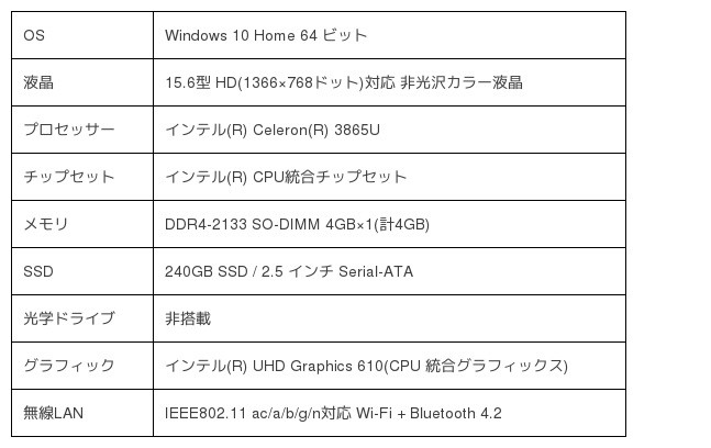 CPUに低消費電力のCeleron Uを搭載し、内蔵ストレージはSSDで240GBという構成の15.6型HDノートパソコンです。もちろんBTOに対応していますので、お好みのスペックへのカスタマイズやオプションの追加が可能です。