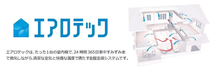 「エアロテック」は、たった1台(※1)の室内機で24時間365日、家中をすみずみまで換気しながら、清潔な空気と快適な温度で満たす全館空調システム。部屋ごとに快適な温度設定ができ、外気を取り入れる際に花粉やカビの胞子を97%カットする一方、汚れた空気とともにホコリやペットのにおいを屋外に排出します。さらに、業界最長レベルの長期10年保証と10年間の無償点検という充実したサポート体制も大きな特長です。「エアロテックFit」は、エアロテックの基本性能はそのままに、小規模の住宅やリフォームなどさまざまな目的やシーンに応じて導入しやすくしたモデルです。