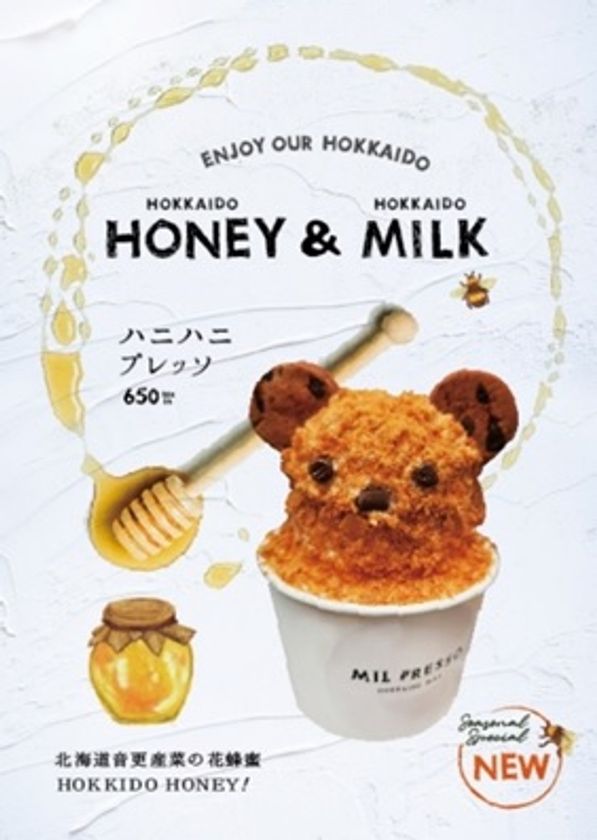 北海道北広島 行列のできるソフトクリームショップ「MIL PRESSO」夏の新作「見つめるクマ!僕でハニハニしてね?」な、ソフトクリーム。可愛いクマさんのソフトクリームを発売します。