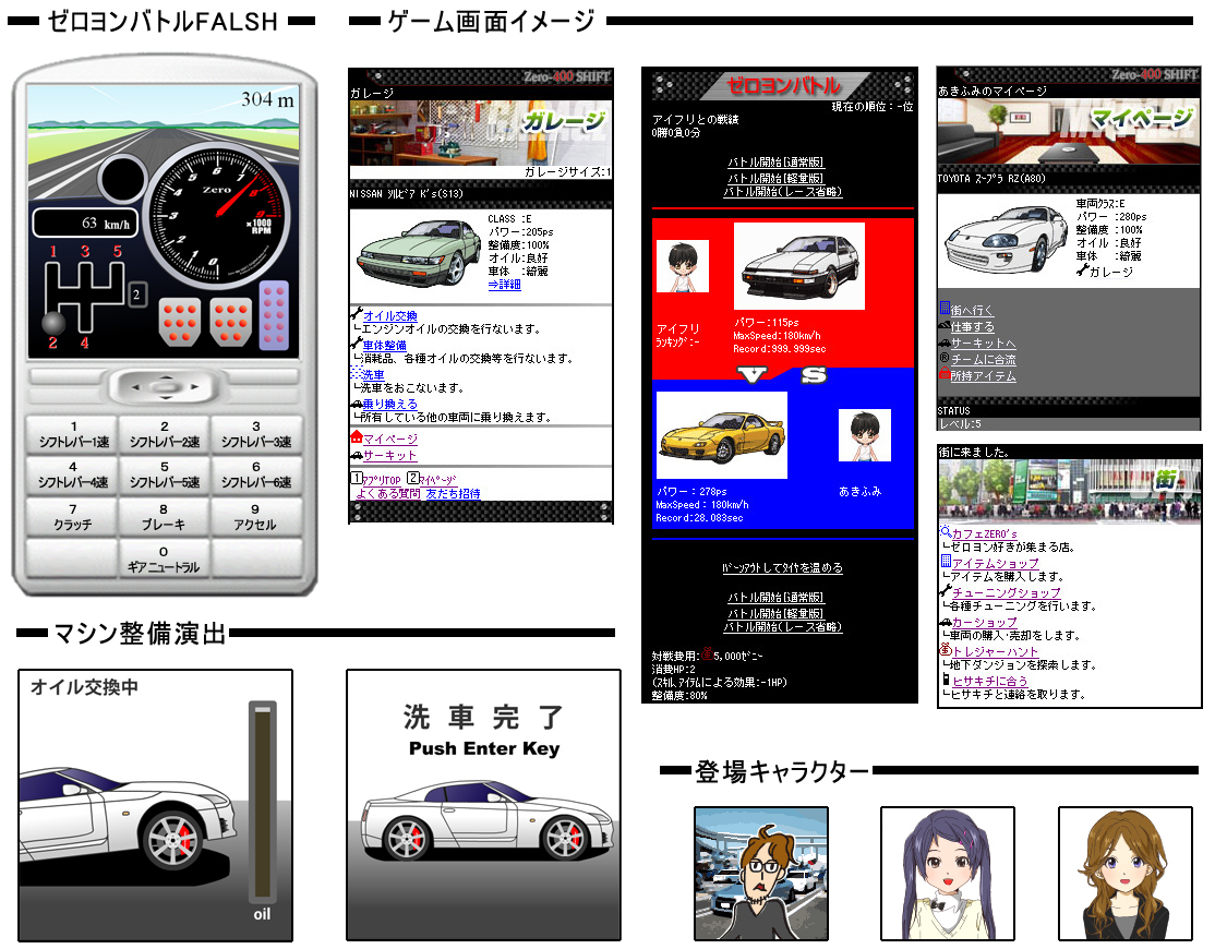 「Zero-400 SHIFT」はゼロヨン最速を目指す為に他のユーザーと交流をしながらゲームを進めていく、ケータイ向けソーシャルレーシングゲームです。他のユーザーとのバトル(レース)はFLASHを用いたリアルな操作感を楽しめます。