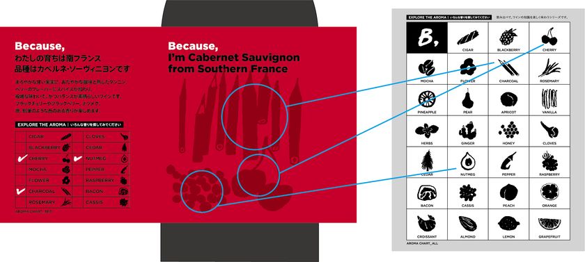 消費者が簡単に自分好みのワインを見つけられるよう、当社ではあくまでクオリティに拘ったうえで、「ワインの教科書になる」ワインのシリーズを発売しました。「知れば知るほど、ワインはおいしい。」をコンセプトに、ぶどうの「産地」と「品種」のみに情報を絞り、アロマや特長を視覚で把握できるようなチャートを併記した、新しいワインシリーズです。