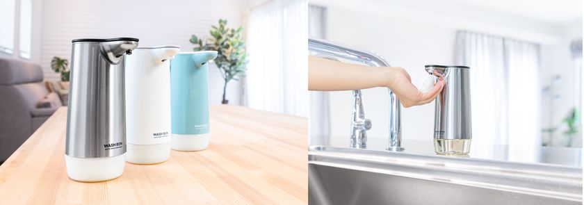 「ウォシュボン オートソープディスペンサー」は、手をかざすことでセンサーが反応し、適量の泡ハンドソープが吐出される自動ディスペンサーです。手洗いを快適にするだけではなく、ポンプに触れないため接触感染のリスクを低減します。また、泡の吐出量は1mL、2mLの2段階切り替えで、手の小さいお子さまから大人まで家族全員の手洗いにお使いいただけます。