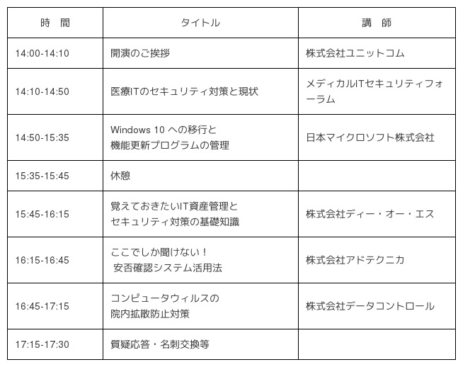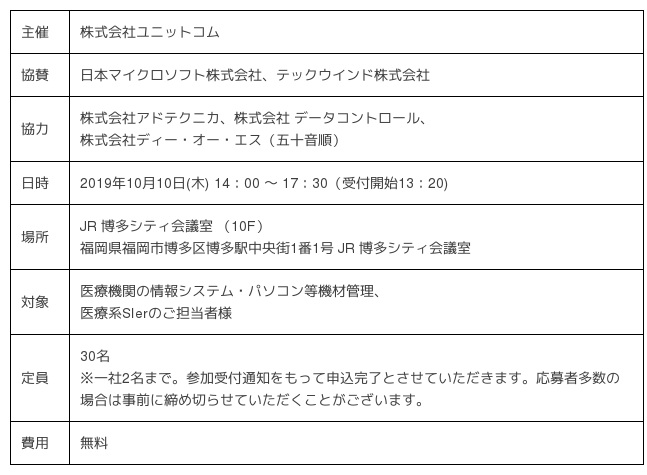 株式会社ユニットコム「医療機関におけるWindows 10 への移行とセキュリティセミナー」を福岡で2019年10月10日(木)に開催