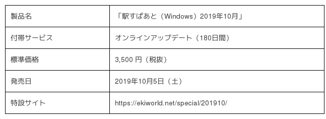 乗り換え案内サービス「駅すぱあと」を提供する株式会社ヴァル研究所(本社:東京都杉並区、代表取締役:菊池 宗史)は2019年10月5日(土)、消費税増税に伴う鉄道事業者の運賃改定や私鉄の秋のダイヤ改正、新駅開業、駅名変更などに対応した「駅すぱあと(Windows)2019年10月」を発売します。