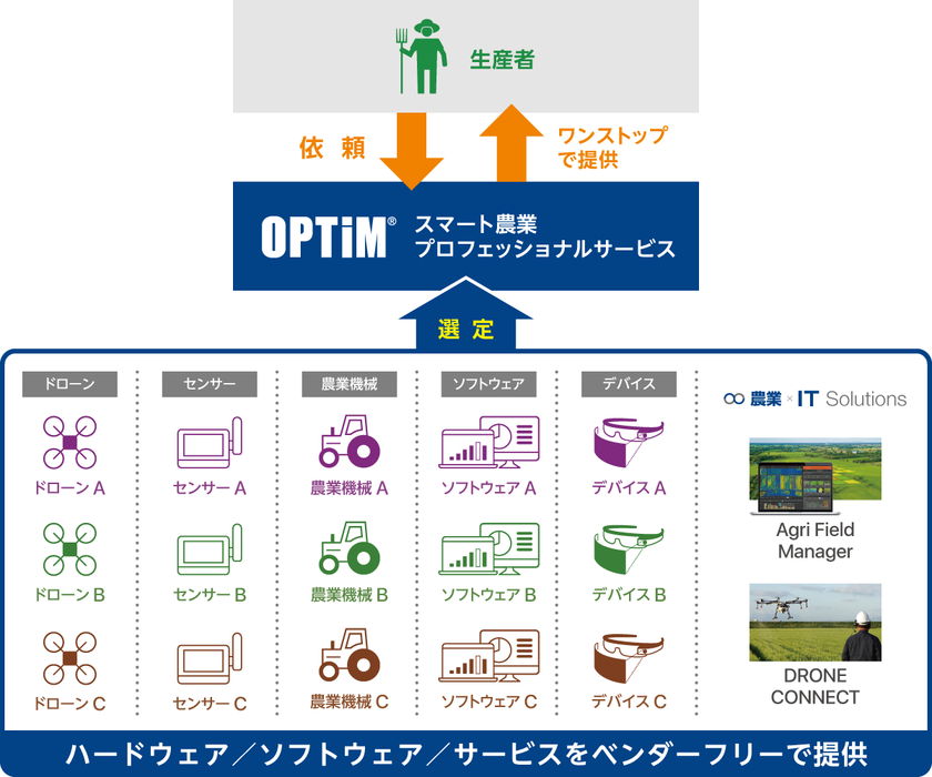 「スマート農業プロフェッショナルサービス」では、農業向けハードウェア、ソフトウェア、サービスなどの提供に加えて、オプティムが持つAI解析技術、並びに保有している当社知財を活用し、ワンストップでスマート農業に対するニーズに応えていきます。