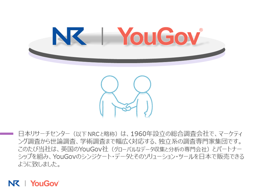 株式会社 日本リサーチセンター(NRC)は、英国のYouGov社と日本市場向けに独占的なパートナーシップを組み、2つのシンジケート・データとそのソリューション・ツールを日本で営業開始いたしました。