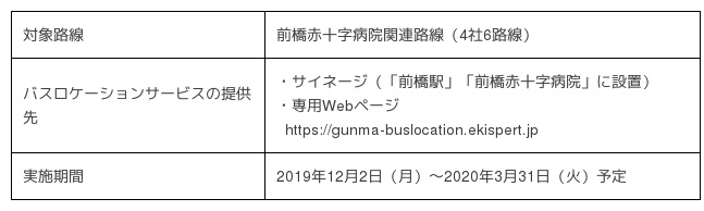 「バスロケーションシステム実証実験」は、株式会社群馬バス、群馬中央バス株式会社、日本中央バス株式会社、永井運輸株式会社の協力により、前橋赤十字病院関連路線を対象に2019年12月2日(月)〜2020年3月31日(火)の実施を予定しています。地域におけるバスロケーションシステムの実現性を検証するとともに今後の方針を検討し、バスロケーションシステムの普及による公共交通の利用促進を目指します。