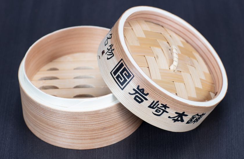 岩崎本舗のロゴが入った特別なせいろで角煮まんじゅうを簡単に蒸しあげられます。