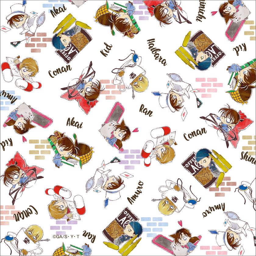 各キャラクターをイメージするアイテムに寄り添うように、デフォルメされたコナンたちの姿がとってもキュート!ふんわりとした水彩タッチの色づかいと線画風に描かれたイラストで、普段使いのしやすいお洒落なデザインに仕上げました。