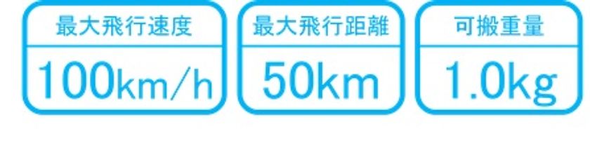固定翼の採用による前進効率の向上、機体全体の空力性能の向上ならびに徹底的な機体の軽量化により、最大飛行距離50kmを実現しました。従来機に比較して5倍遠距離まで飛行することが可能です。