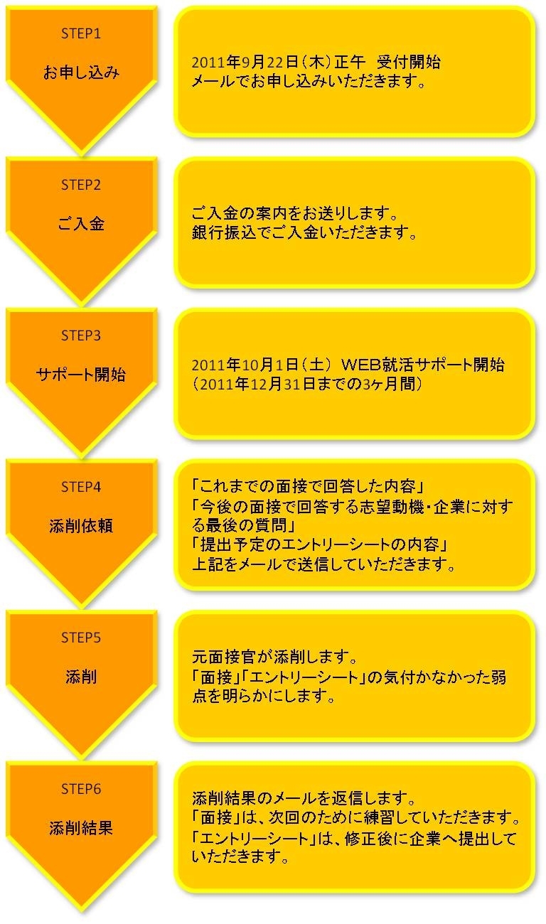多くの学生は、面接で答えた内容が正しかったのかどうか分からない状態で就職活動を続けています。そこで、エントリーシートに加えて、面接時の回答についてもEメールで添削する新しいサービスの提供を始めます。来春の卒業まで約6ヶ月、就職活動中の学生が抱える焦り・不安は増しているはずです。本サービスの投入により、1人でも多くの学生が焦り・不安から解放されることを願っております。