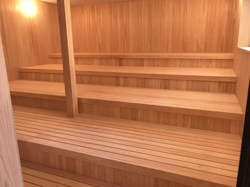 〈サウナ室〉一段一段足が伸ばせる広々サウナ。テレビも完備。