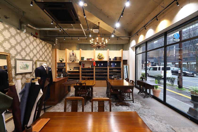 『福岡えびすテーラー』は、大名地区の並木通りが美しい赤坂に位置し、天神の喧騒から少し離れた落ち着いた空間で自分だけの1着を仕立てることができます。