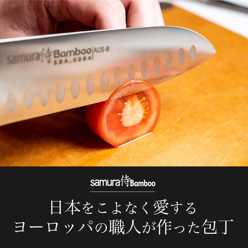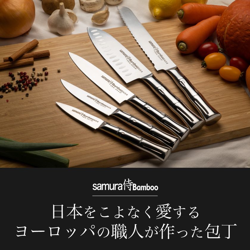 「samura Bamboo 包丁」は、日本とヨーロッパの技術を統合させて作られた包丁です。用途に応じた三徳包丁、パン切包丁、ユーティリティナイフ、ステーキナイフ、皮むき包丁の5本を用意しました。