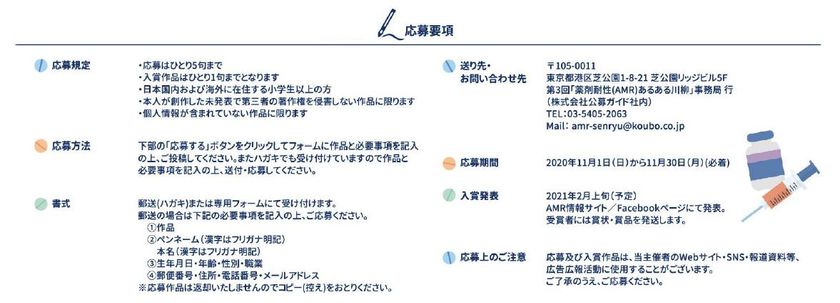 その啓発活動の一環としてAMR対策について、一般の方にも自分の事として関心をもって、理解を深め、考えていただくため、昨年に続き、第4回「薬剤耐性(AMR)あるある川柳」の公募を行います。