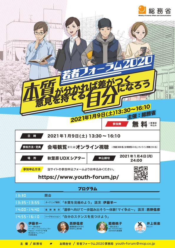 総務省では、これまでにも若者への選挙啓発活動を行って参りましたが、今回は「若者フォーラム2020 本質が分かれば差がつく 意見を持てる自分になろう」と題しまして、2021年1月9日(土)に若者に向けたフォーラムを開催いたします。