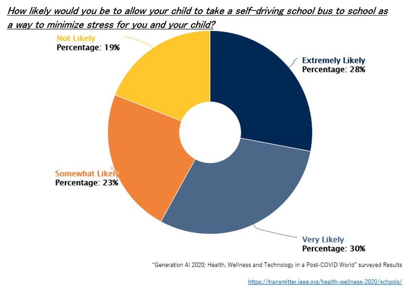 世界中で子どもたちがバーチャル授業でリモート学習をしていたり、登校して対面授業を行っていたり、それらを組み合わせたりしています。どのような状況であれ、仕事をしながら子どもを時間通りに学校に送るのは、親にとっても子どもにとってもストレスになり得ます。自動運転スクールバスは世界中で試験的に運行されており、試験で安全性が担保され、世話ロボットがスタッフとして乗車するなら、世界の58%の親が、自身のストレスを最小限にするために、そのような乗り物に子どもを乗せてもよいと考える可能性が高い、または非常に高いとしています。