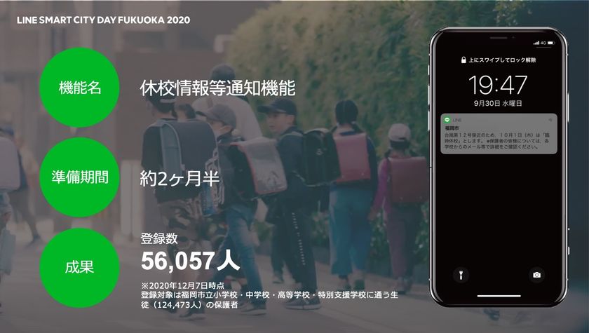 休校に際しては、ひとり親や共働き世帯は、子どもだけの留守番に不安がある場合に勤務先の休暇の取得やそれに伴う業務処理、留守番させる場合は昼食の準備など様々な対応が求められます。保護者に情報を早く届け、対応の負荷を軽減することを目的に、福岡市LINE公式アカウントから一斉休校の情報を受け取れる機能を導入。この機能の登録者数は5万6,057人となっております。(2020年12月7日時点)