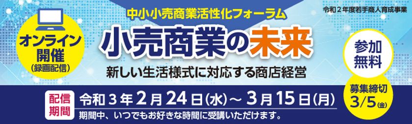 東京都並びに公益財団法人東京都中小企業振興公社では、商店主の皆様の経営意欲の増進を図るため、中小小売商業活性化フォーラムを開催しています。今年度は、「小売商業の未来〜新しい生活様式に対応する商店経営〜」をテーマに全てのプログラムをオンラインで実施いたします。コロナ禍の中、新しい日常、新しい生活様式に取り組まれている事業者の皆様からのお申込みを心よりお待ちしております。