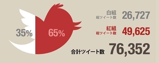 総ツイート数に対して、ツイート数の多い組がTwitter上で話題になった組となります。結果、投票結果同様に紅組が6割以上を占め勝利しましたが、両組での話題率の差(※)は、投票結果以上に大きくなりました。(図1)