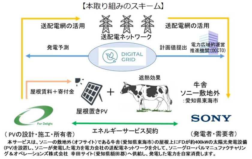 本取り組みでは、ソニー敷地外の牛舎(愛知県東海市)の屋根に設置した約400kWの太陽光発電設備で発電したソニーグループの電力を、電力会社の送配電ネットワークを介し、約30km離れたソニーグローバルマニュファクチャリング&オペレーションズ株式会社の幸田サイト(愛知県額田郡)へ供給(自己託送)することにより、この発電した電力の自家消費を実現します。