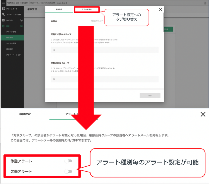 権限管理と併せて、閲覧権限単位・アラート種別単位で通知の要否を設定できるようになりました。また、アラートの通知はグループ単位で設定した閲覧権限所有者に対してのみ発報されるようになりました。