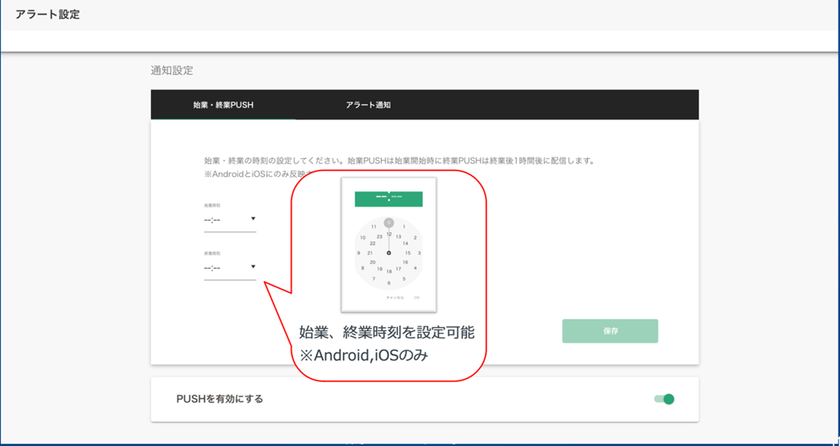 管理者用の設定画面から始業/終業時刻を設定し、その時間に「Optimal Biz Telework」のエージェントアプリに対してPush通知を行うことが可能となりました。煩雑な始業/終業の申告を簡単にし、打刻忘れを防止します。