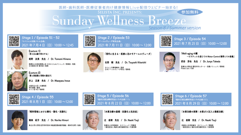 セリスタ株式会社(東京都千代田区、代表取締役:伊藤 承正)は、2021年7月4日(日)より、アンチエイジング・予防医療情報 無料Live配信Zoomウェビナー『Sunday Wellness Breeze, Season 8 Summer version』全6ステージ合計7講演を開催いたします。