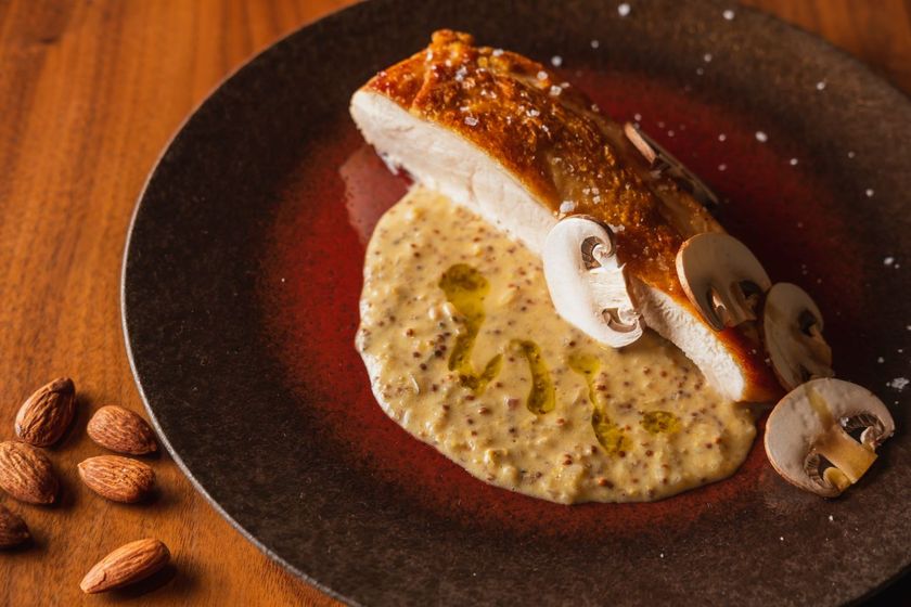 アーモンドミルクとマスタードをソースに使って、淡白になりがちな鶏肉をパンチのある味に仕上げました。ソースに使ってもダマにならないのが特徴です。