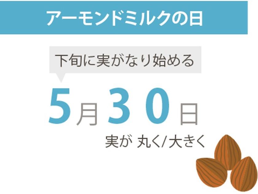 アーモンドミルク研究会( https://www.almondm-labo.jp )が、アーモンドミルクの原材料であるアーモンドが、5月下旬から実がなり始めることから、アーモンドの実(3)が丸く(0=○)なる、実(3)が大きく(0=Oオー)なる5月30日を「アーモンドミルクの日」として制定しています。
