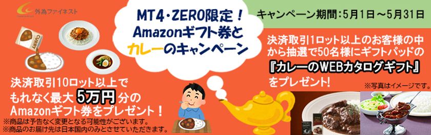 外為ファイネスト株式会社(本社:東京都千代田区、代表取締役:石野 由美子)は、2021年5月1日より「MT4限定!Amazonギフト券とカレーのキャンペーン」「MT4延長決定キャンペーン!第2弾」を実施いたします。