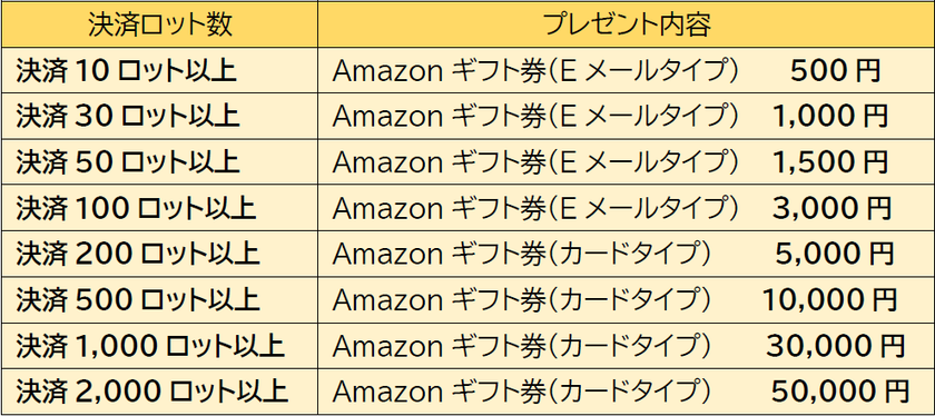 期間中の決済取引ロット数に応じて、Amazonギフト券(最大5万円)をもれなくプレゼント、更に、抽選で50名様に、ギフトパッドの「カレーのWEBカタログギフト 5千円相当」をプレゼントいたします。