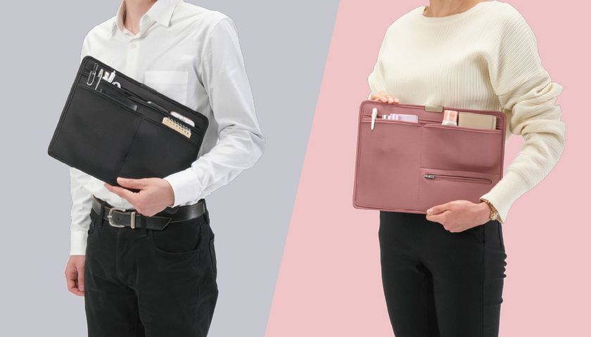 ●伸びる素材で収納力抜群のポケット+硬い素材で書類が折れないファイル機能