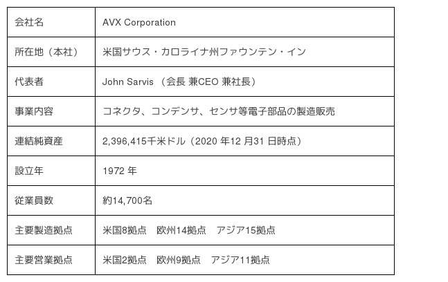 AVX は、京セラの完全子会社であり、電子部品、コネクタ、センサ等の幅広い製品群を有するグローバル・リーディングカンパニーであると同時に、研究開発や積極的な M&A により、製品ラインアップ及び事業領域、並びにシェアの拡大を図っています。