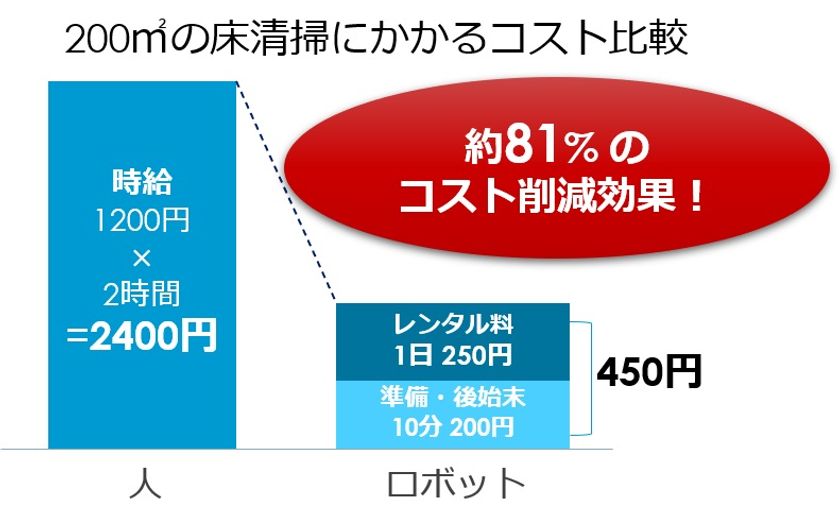 床面積200平米(60坪)をスタッフが掃除機掛けと水拭きを行うのに比べ、大幅なコスト削減効果を期待できます。