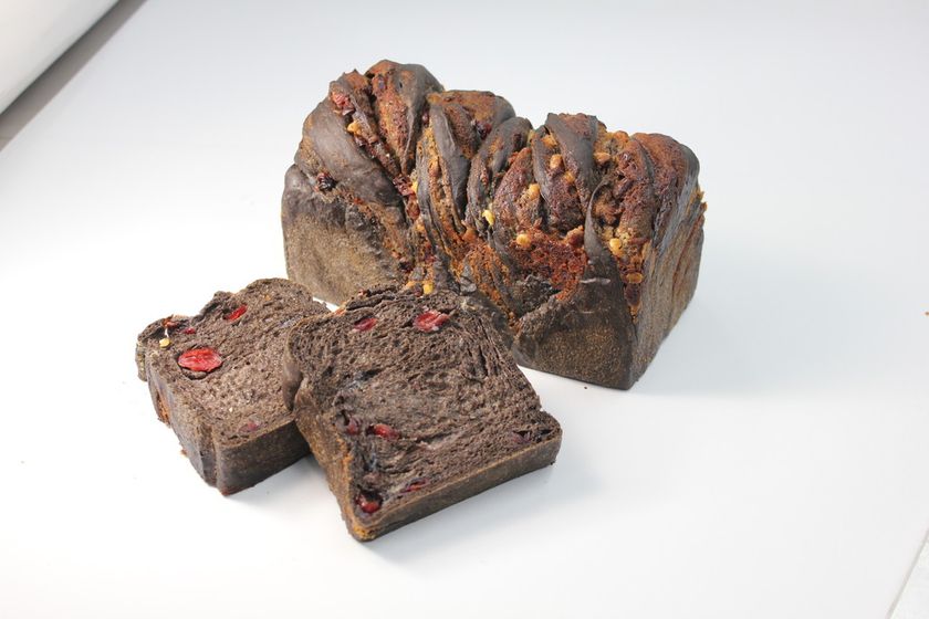 甘さ加減が絶妙な黒い食パンです。そんな悪魔的な食パンも、生地に練り込んだブラックココア・クランベリーとつぶあんの意外な組み合わせでやみつきになるおいしさ!