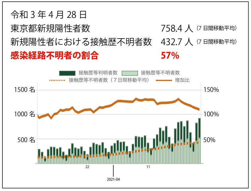4月28日東京都発表の感染者数の推移から判断しても、従来の対策だけでは、大規模な感染拡大は避けられないと考えるべきでしょう。以下のデータからも読み取れるように、これまで、新規感染者のうち約6割が接触歴不明者である事実からも、エアロゾル感染、空気感染のリスクを考慮し、その対策を行うことは、極めて重要であると考えられます。