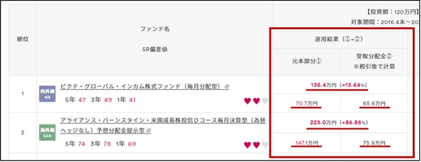 ※一般的な「分配金込みの運用実績」ではなく、期間1年、3年、5年で分配金がいくら支払われ、元本がどうなったかが理解できます。