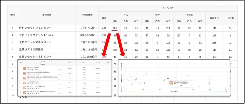 ※運用会社の全体での運用資産や、どの投資対象で何本のファンドを提供しているのか、また、そのファンド数をクリックすると該当のファンドリストやリスク・リターンマップが表示されます。