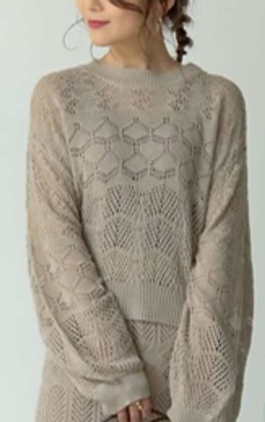 シアーな風合いがセンシュアルな透かし編みショートニットトップス。ぽわんとしたシルエットの袖がフェミニンさをプラスし、直接ふれてもちくちくしない肌当たり優しい素材。