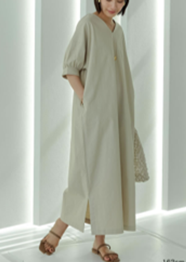 程よくボリューム感のあるパフスリーブが魅力のロング丈ワンピース。袖のボリューム感にVネックのドロップショルダーデザインに仕上げることで抜け感をプラス。デコルテやサイドスリットから上品に肌見せをすることで、カジュアルになりすぎず大人スタイルの着こなしに。袖デザインで少し立体感を演出して華奢見えが叶うのは嬉しい。ゆったりした身幅と肌当たりの優しいコットンブレンド素材でリラックス感抜群のアイテム。
