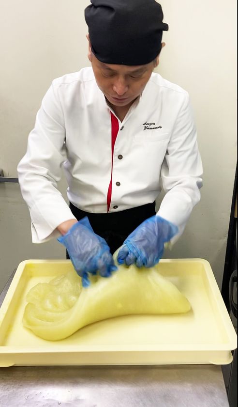 店主の山本 宗禅がそう心に決めたのが今から10年前のことでした。「フルーツの香りやフレッシュな美味しさを残すためにはどうすればいいか?」そこでひらめいたのが、大福の皮にもフルーツを入れたわらび餅を用いることでした。しかし、一般的に和菓子屋さんが作るわらび餅は、素材を加熱しながら練り上げて作るため、フルーツを混ぜてもその風味や香りはすべて飛んでしまいます。フレッシュなフルーツのわらび餅を開発するために試行錯誤を繰り返すこと3年。ついにたどり着いたのが、“自在に餅を操る上技師の技術を用いた『手揉み急速冷凍製法』”でした。これはできたて熱々のわらび餅をすぐさま急速冷凍庫に入れ、餅をギュッとひき締めた後に、フルーツの果実や果汁を合わせて手で揉むという製法です。