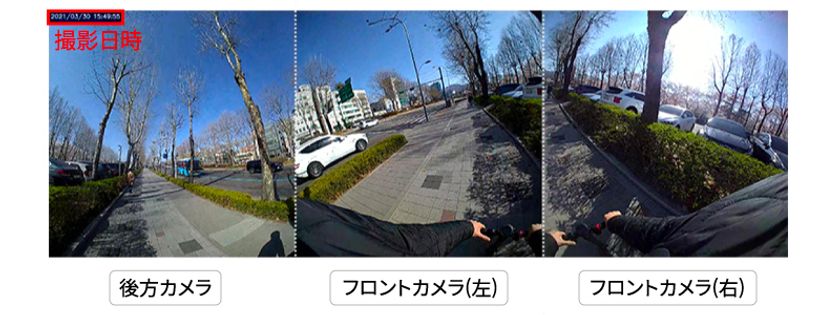 交通事故の約5割にあたる側面事故の録画にも対応できる3チャンネル式(フロントカメラ2個、背面カメラ1個)