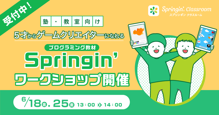 株式会社しくみデザイン(本社:福岡市博多区、代表取締役:中村 俊介、以下「しくみデザイン」)は、塾・教室を対象に5才からゲームクリエイターになれるプログラミング教材「Springin'(スプリンギン)」のワークショップを6月18日(金)と6月25日(金)13:00〜14:00に開催いたします。