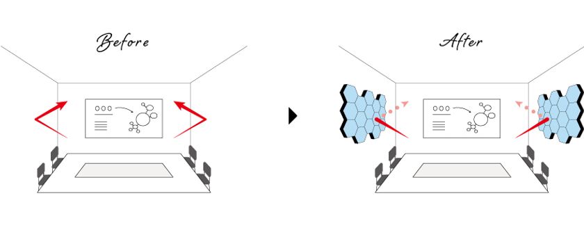 Beforeのように音は壁に当たると反射し、「声が聴き取りづらい」「ざわざわしている」等の不快感の元になりますが、OTTO Rを貼ることで、壁に当たる音を吸収。反射を抑え、不快な響きを改善することができ、フロア内のざわつきやハウリング、昨今増えているWEB会議での反響音による聞き取りづらさ等、オフィスにおける音問題を解決します。