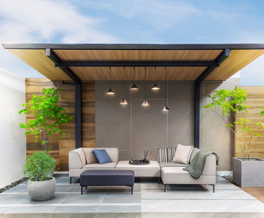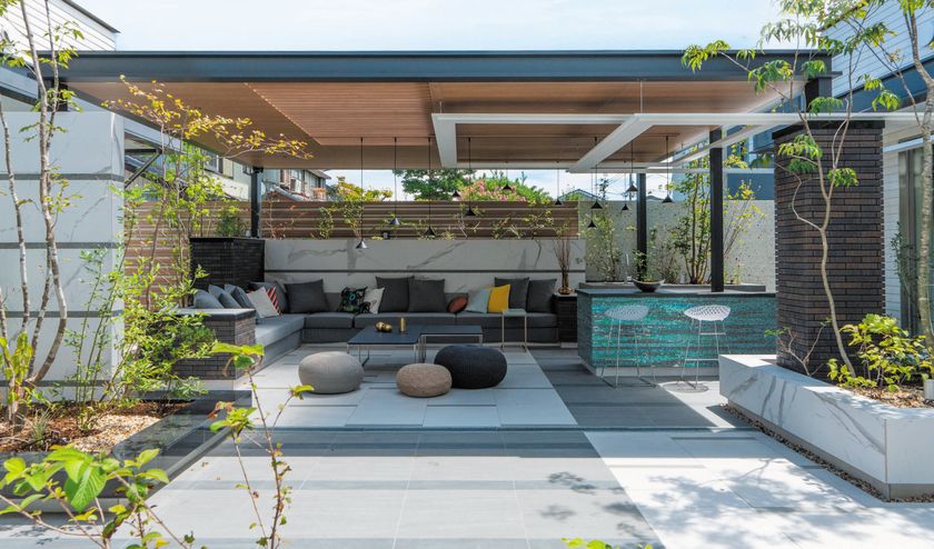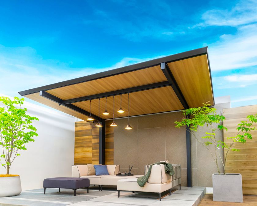 庭にもうひとつの部屋をつくる「Rテラス」。無駄をそぎ落とした洗練されたフレームデザインと、木目調の美しい表情が感じられる天井屋根が合わさることで、住まいと調和するテラスが生まれます。ガーデンソファで囲んでも綺麗に収まる機能的なサイズ感を実現。オプション照明を付けることで、日中とは異なる夜の美しい情景に包まれます。