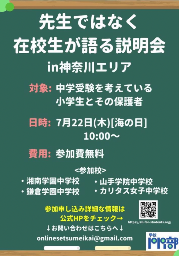中学受験を考えている親子向けのオンライン説明会「現役中高校生によるオンライン学校説明会」を7/22開催